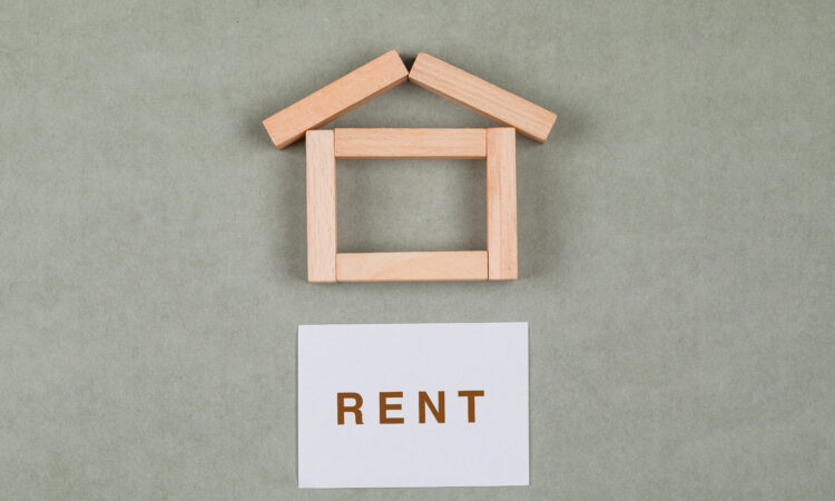 Renting house concept with wooden blocks, sticky note on grey background flat lay.